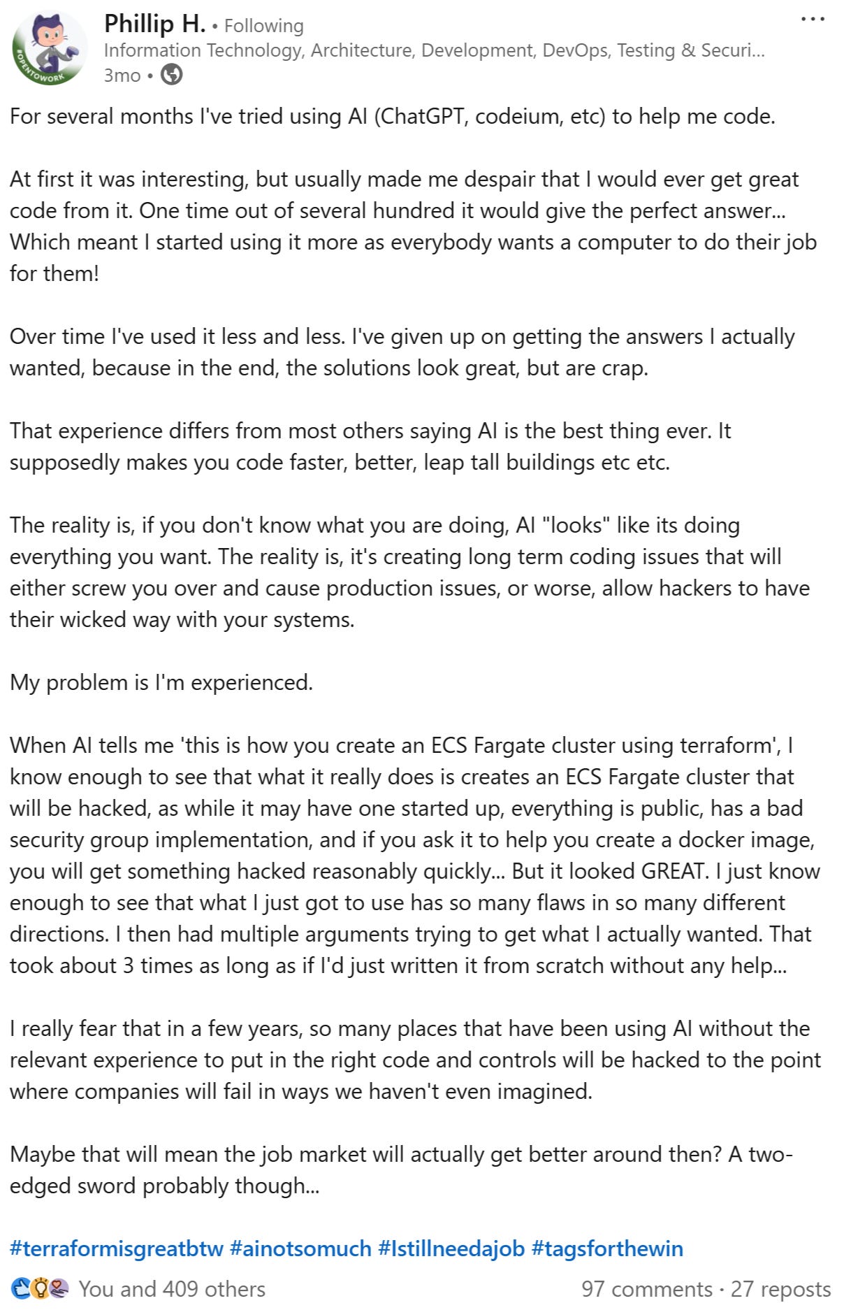 There you have it. Testimony from coders and non-coders alike, who actually tried “AI coding” and saw just how hard it fell flat on its face.